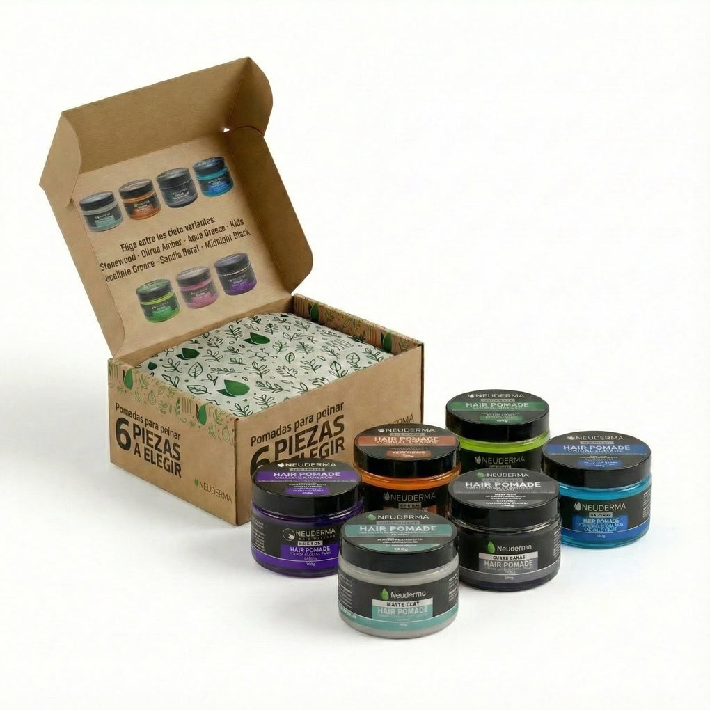 Transforma tu rutina de peinado en un ritual de estilo con el Kit de 6 Pomadas Neuderma. Este kit fue creado para los que quieren más: más expresión, más control, más esencia propia. Tú eliges las 6 que te acompañarán cada día: desde aromas vibrantes y texturas matte hasta fórmulas específicas para los más peques… o para los que quieren decirle adiós a las canas visibles.